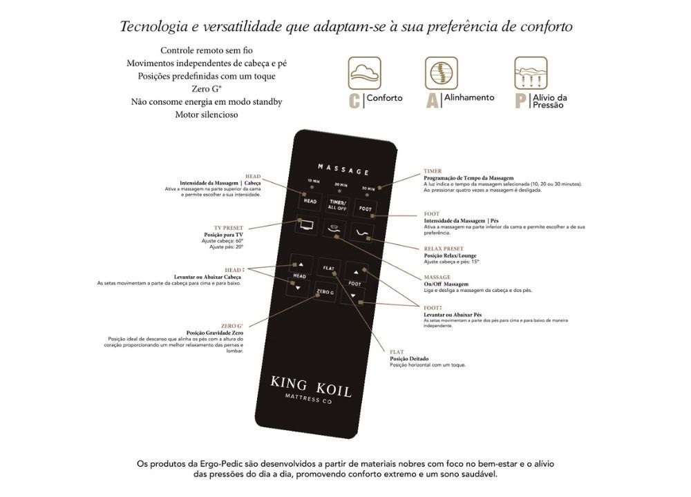 A cama ajustável Ergo-Pedic é uma das inovações tecnológicas em sistemas de descanso mais significativas deste século. Com um simples toque, a cama ajustável Ergo-Pedic adapta-se para a posição desejada, proporcionando um posicionamento ergonomicamente correto que suporta a curvatura natural da coluna, distribuindo uniformemente a pressão para aliviar dores musculares e articulares.